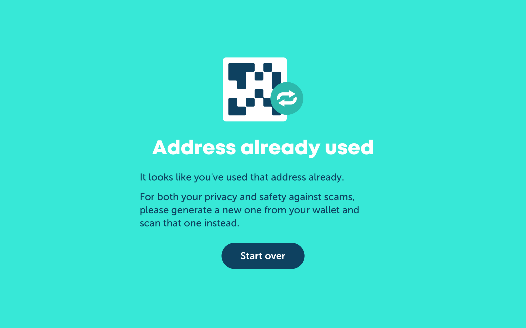 With this feature enabled, if an address has already been used by anyone at your network of ATMs, a customer attempting to scan the same address is presented with a screen prompting them to generate a fresh one.