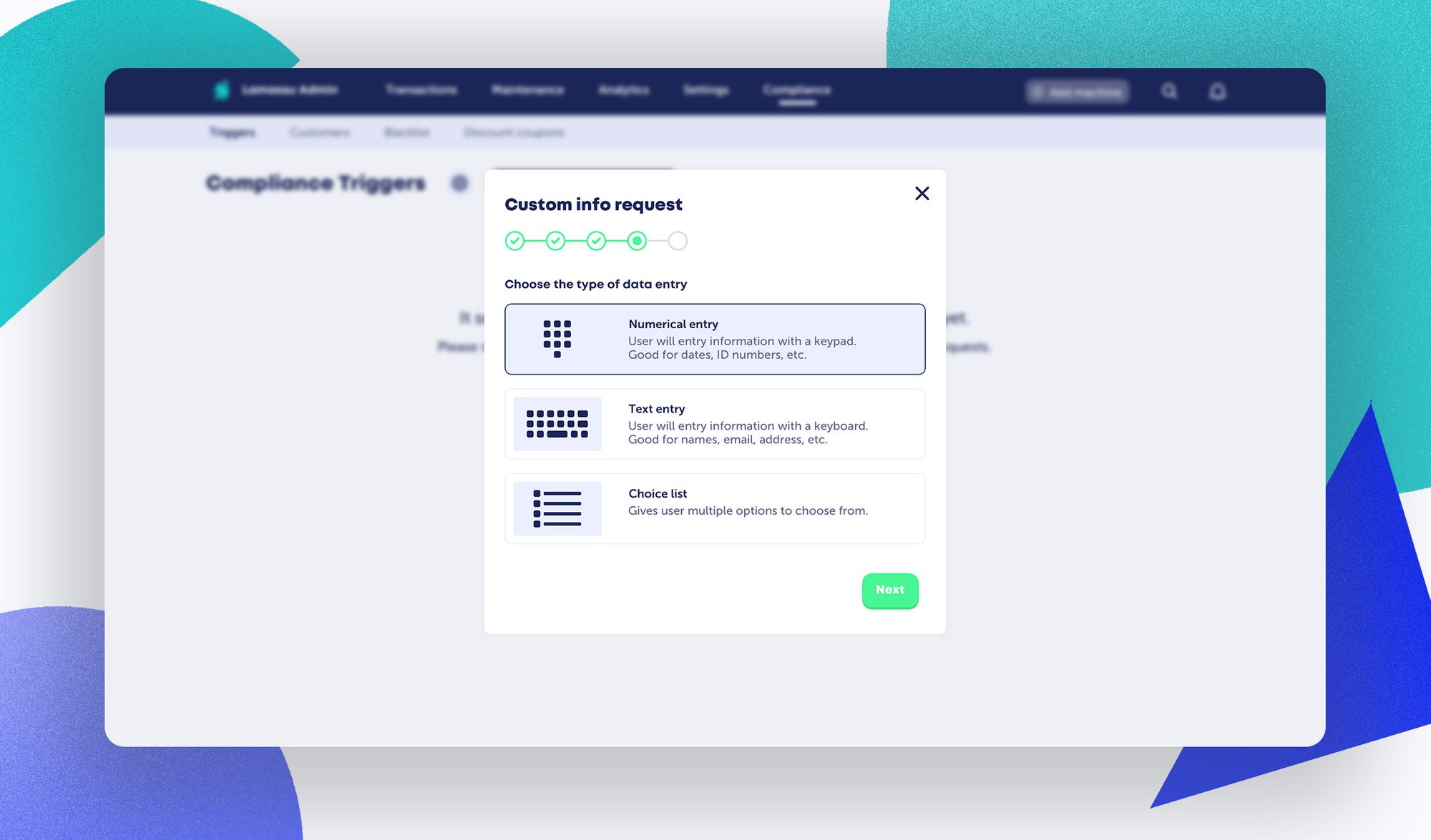 Custom info requests introduce the ability to prompt your customers for anything you'd like, and in multiple formats. Define your prompt, then choose the entry format: numerical (dates, ID numbers, etc.), text (names, addresses, e-mail, etc.), or choices from a list of options.