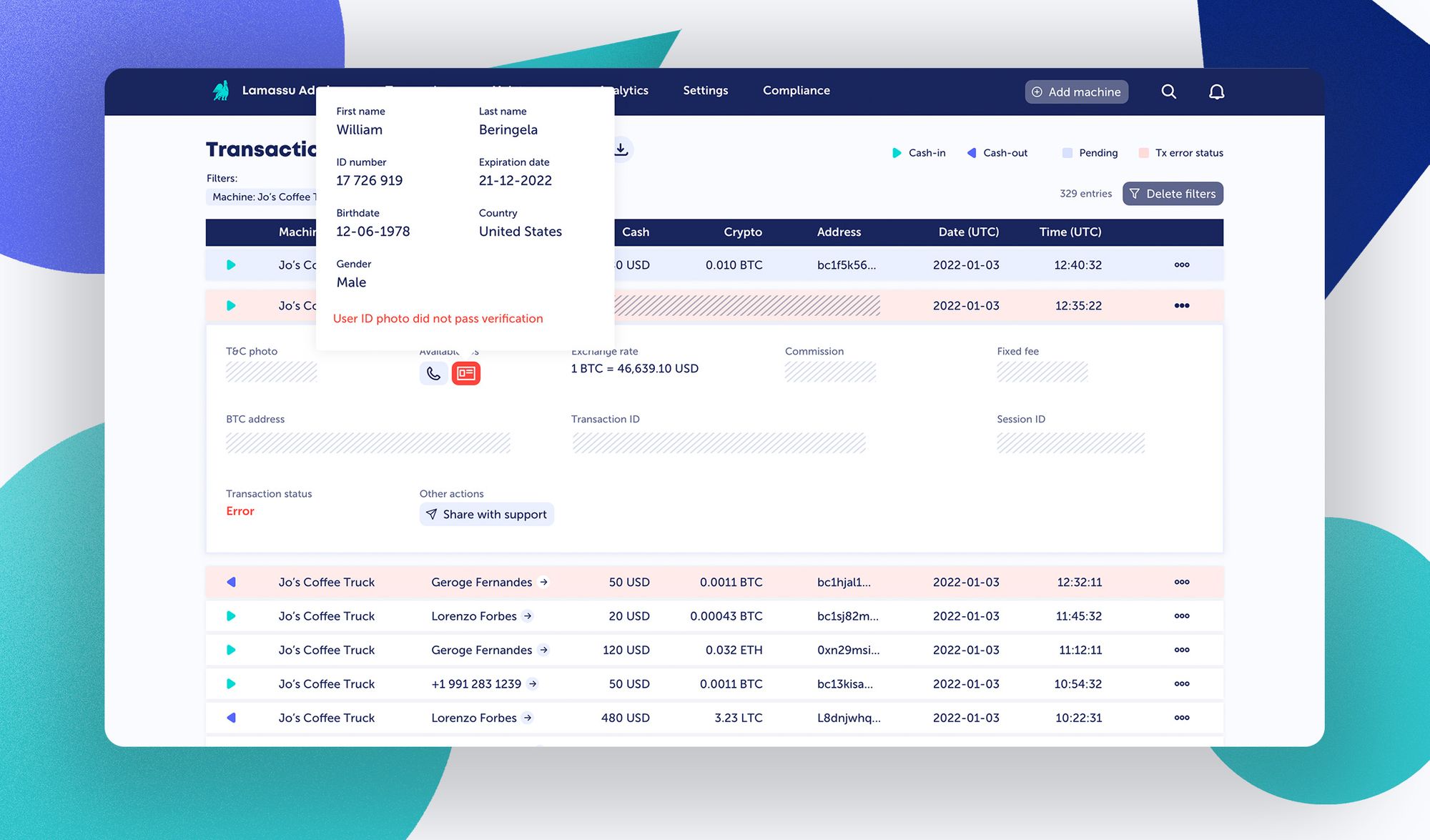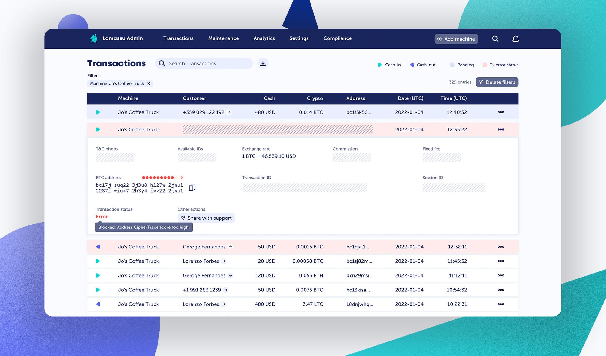 If addresses involved in either cash-in or cash-out transactions are scored above a risk threshold of your choosing, the transaction is immediately cancelled and the user prompted to contact the operator for additional steps.